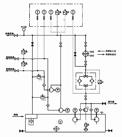 稀油站二根高壓輸出管道的壓力均為31.5MPa,流量各為2.5L/min,低壓部分的壓力為0.4MPa,低壓流量為16~100L/min;稀油站具有過濾、冷卻、加熱等裝置和聯(lián)鎖、報警、自控等功能。